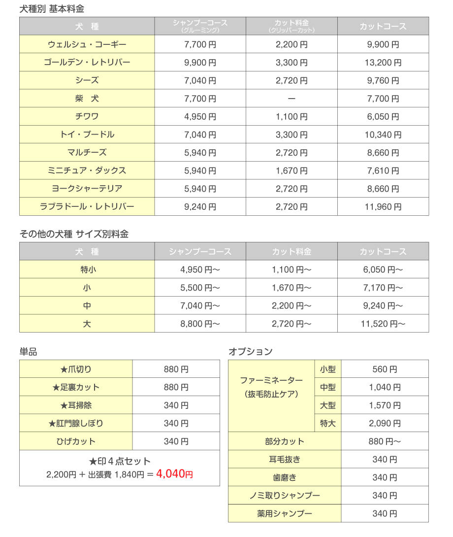 ※ミックス犬に関しましては、大きさの近い犬種の料金になります。
